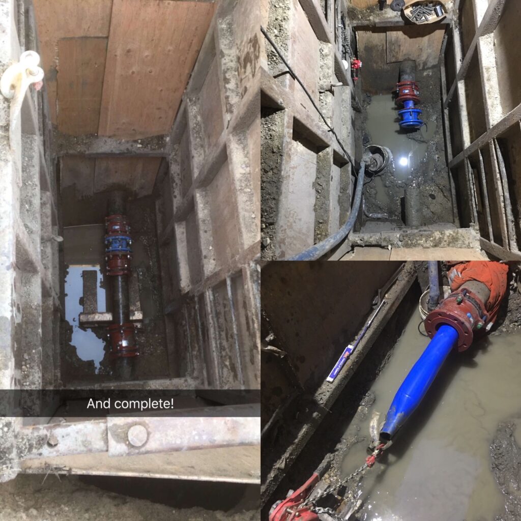 In preparation of the installation of the Primus Line system, we isolated the flow of water to guarantee no water would be present during the renovation time. In a first step, we excavated an entrance and pull pit on either side of the multiple sets of tracks and cut out a small section of pipe. The pipe was then CCTV inspected to assess the condition of the host pipe.